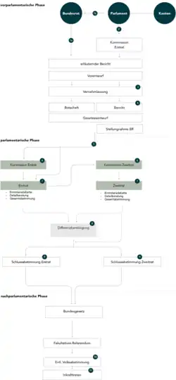 Aufgrund der Ergebnisse des Vernehmlassungsverfahrens wird der Erlassentwurf durch das zuständige Departement oder durch die zuständige Parlamentskommission nochmals geprüft und gegebenenfalls überarbeitet. Eine Kommission unterbreitet ihren Entwurf zusammen mit ihrem Bericht ihrem Rat. Ein Departement unterbreitet seinen Entwurf dem Bundesrat. Ist der Bundesrat mit der Formulierung einverstanden, überweist dieser den Entwurf zusammen mit der Botschaft des Bundesrates an die Bundesversammlung. Ansonsten geht der Entwurf zur nochmaligen Überarbeitung an die Verwaltung zurück.