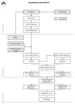 Verschiedene Akteure, Parteien, Interessengruppen, Verbände, die Regierung (Bundesrat), die Kantone, die Bundesverwaltung, die Kommissionen und Fraktionen der Bundesversammlung oder einzelne Parlamentarier, können den Anstoss zu einem Erlass (Bundesverfassung, Gesetz, Parlamentsverordnung, Bundesbeschluss) geben. Je nach Akteur sind dazu folgende Instrumente möglich: