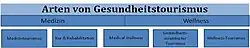 Die Segmente des Gesundheitstourismus sind bisher nicht einheitlich unterteilt bzw. abgegrenzt, denn der Markt ist sehr vielfältig und bringt ständig neue Zweige hervor. Der gesundheitstouristische Markt unterteilt sich im Wesentlichen in die Teilmärkte „Medizintourismus“, „Präventions-/Rehabilitationstourismus“ (Kurtourismus), „Medical Wellness (-tourismus)“, „gesundheitsorientierter Urlaub“ und „Wellnesstourismus“.[18][19][20]
