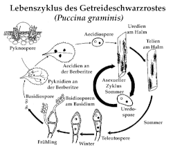 Wenn Pilzsporen von Puccina graminis auf Weizenpflanzen landen, bilden sie Pusteln und extrahieren Nährstoffe, die für die Kornentwicklung bestimmt sind.[3]