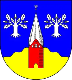 Blasonierung: „In Blau ein gewellter goldener Berg, davor ein roter spätgotischer Kirchturm mit achtseitigem silbernen Helm. Beiderseits desselben je ein schwebender, bewurzelter silberner Eichbaum.“[7]