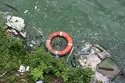 Im offenen Meer macht sich die Gewässerverschmutzung an vielen Stellen schon mit bloßem Augen bemerkbar, unter anderem als Müllstrudel. Dabei handelt es sich um ozeanische Wirbel, in denen sich aufgrund der Meeresströmungen riesige Müllteppiche angesammelt haben. Der größte davon befindet sich im Nordpazifik.[11] Weitere Ursachen sind Ölverschmutzungen, chemische und radioaktive Altlasten in den Meeren und das weitverbreitete Einleiten ungeklärter Abwässer in das Meer.[12] Geschätzt gelangen so bis zu 13 Millionen Tonnen Müll jährlich in die Ozeane. Insbesondere Länder im asiatischen Raum tragen dazu bei, dass über Mülldeponien eine enorme Menge Plastik aus der Industrie sowie aus Privathaushalten direkt in den Flüssen entsorgt wird.[13] Zusätzlich zu dem Eintrag von Schadstoffen und Müll durch ins Meer mündende natürliche und künstliche Zuflüsse ist der marine Schiffsverkehr ein großer Belastungsfaktor. Diesem Umstand wurde durch die Verabschiedung des Internationalen Übereinkommens zur Verhütung der Meeresverschmutzung durch Schiffe Rechnung getragen. Bei Havarien von Schiffen – insbesondere Tankern – oder Gas- und Ölbohrplattformen ist das Gefährdungspotenzial entsprechend noch höher.
