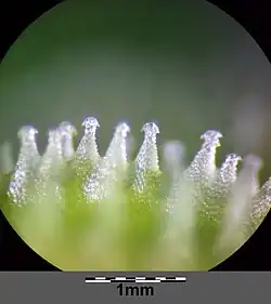 Viele Blüten befinden sich in einem zuerst kopfigen, später sparrig sich verlängernden, in Wickeln rispig angeordneten Blütenstand.[1]