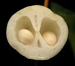 Die kahlen Früchte sind weiß, fast kugelrund, schwammig-saftig und haben einen Durchmesser von 10 bis 15 mm. Die Frucht ist eine Steinfrucht mit Kelchresten an der Spitze, mit zwei Kernen, wird jedoch manchmal als Beere[1] bezeichnet. Sie reifen zwischen Juli und Oktober und bleiben bis in den Winter hinein am Strauch. In einer Frucht befinden sich zwei glatte, harte, einsamige Steinkerne, die 4,5 mm lang, elliptisch und abgeflacht sind.