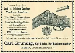 Spätestens ab 1904 wurde das Unternehmen als offizieller Hoflieferant des sächsischen Königshauses geführt.[53] Seit 1915 vertrat Gründig zudem die Waffenhersteller J. P. Sauer & Sohn und Mauser. Daneben hielt das Unternehmen mehrere Patente für spezielle Patronen und eine Umstellvorrichtung für den Abzug von mehrläufigen Gewehren.[54] Während der Bombardierung Dresdens im Zweiten Weltkrieg am 13. Februar 1945 wurden die Betriebsgebäude völlig zerstört.