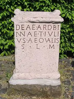 Eher unauffällig steht heute in der Nähe des Dorfplatzes eine Kopie des Ardbinna-Steines. Dieser wurde 1859 bei der Rodung des Beybusches im Anstieg aus dem heutigen Beytal gefunden. Da Gey in der Römerzeit noch zu dem Gebiet der Ardennen gehörte, setzte ihn der römische Dedikant Titus Julius Aequalis als Votivgabe an die Ardennengöttin Ardbinna, die ihn schützend durch den Bergwald geleitet hatte. Die Weihinschrift lautet übersetzt etwa „Diesen Stein setzte Titus Julius Aequalis der Göttin Ardbinna“. Gefolgt von der lateinischen Formel S(olvit) L(ibenter) M(erito), die mit „Er erfüllte damit gern und nach Gebühr das gemachte Gelübde“ übersetzt werden kann. Der Originalstein steht heute im Rheinischen-Landesmuseum Bonn.