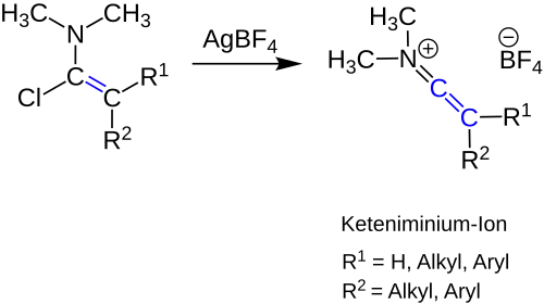 Das Keteniminium-Ion wird erzeugt, indem ein α-Chlorenamin mit Silbertetrafluoroborat umgesetzt wird:
