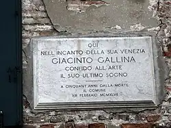Doch Gallina litt bereits im Alter von kaum 40 Jahren unter Typhus, dann einem Leberabszess. Sein Freund, der Bürgermeister Riccardo Selvatico, verheiratete ihn im Krankenhaus noch mit der Künstlerin Paolina Campsi. Doch wenig später starb er. Er wurde auf San Michele beigesetzt.