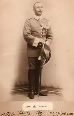 Er beteiligte sich nach Ausbruch des Ersten Weltkrieges an den Kampfhandlungen in Ostafrika und wurde 1916 zum Abteilungsführer ernannt. Er kapitulierte am 24. Januar 1917 bei Likuju und verbrachte den Rest des Krieges in Gefangenschaft. Während seiner Zeit in Ostafrika brachte er zahlreiche Gegenstände der lokalen Bevölkerung in seinen Besitz, die er Museen in Deutschland spendete.[7] Nach Kriegsende führte er den Rang eines Oberstleutnants[8] und wohnte mit seiner Ehefrau und ihren drei Kindern (Joachim, Luise und Wolfgang) in Ballenstedt. Dort betätigten sich beide als NSDAP-Funktionäre. Seine Frau Wanda war unter anderem Leiter der Ballenstedter NS-Frauenschaft.[9]