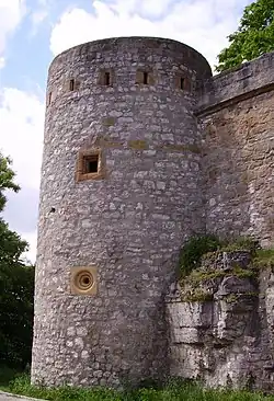 Der mächtige quadratische Bergfried (12,5 × 12,5 Meter) steht frei im östlichen Burgbereich. Der große Turm ist über Eck gestellt und bot so den mittelalterlichen Katapulten und Wurfmaschinen weniger Angriffsfläche. Der Sockelbereich zeigt noch in Teilbereichen das kleinteilige Quadermauerwerk der hochmittelalterlichen Burganlage. Ursprünglich wohl – ebenso wie die davor liegende Schildmauer – durch einen Fachwerkaufbau abgeschlossen, befand sich im Untergeschoss ein Tonnengewölbe und in einem der Obergeschosse ist noch die Kaminanlage für eine beheizbare Turmstube erhalten. Der einzige im Hochmittelalter vorhandene Hocheingang befindet sich an der Nordostseite. Das Rundbogenportal auf Geländehöhe wurde während der Umbauphase der Gebsattelzeit neu angelegt, ebenso der Zugang auf der Westseite, der den die Gemächer des Fürstbischofs beherbergende Nordflügel im Obergeschoss mit dem Bergfried über eine überdachte hölzerne Brücke verband. Aus dieser Zeit stammt auch das etwas zurückgesetzte, rechteckig durchfensterte Obergeschoss. Überdeckt wurde der Bergfried ehedem mit einer schiefergedeckten welschen Haube.
