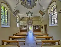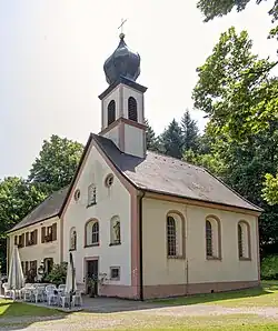 Die Kapelle ist ein Rechtecksaal mit einer polygonalen Apsis im Süden, den ein Muldengewölbe mit Stichkappen überfängt. In der nördlichen Fassade öffnen sich das rechteckige Portal, zwei kleine rechteckige Fenster daneben, ein großes rundbogiges Fenster darüber, zwei Oculi und drei Figurennischen. In den Seitenwänden öffnen sich korbbogige Fenster, drei rechts und zwei links, in den Polygonwänden drei elliptische Oculi. Den Dachreiter krönt eine Zwiebelhaube. Links stößt die Pilgergaststätte an. Zwei Holzsäulen stützen im Inneren eine Orgelempore.