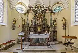 Im Altar tragen vier Säulen mit korinthischen Kapitellen Bögen, von denen geschnitzte Vorhänge herabfallen. Auf den seitlichen Bögen thronen Engel, der linke mit einer Trompete, der rechte mit einer Krone. Vor dem mittleren der drei Oculi versinnbildlicht ein silberner Wolkenkreis den Himmel. Hier trägt ein kleiner Engel auf Kopf und Flügeln ein Marienmonogramm. Zwischen den mittleren Säulen umgeben goldene Strahlen vor mehr silbernen Wolken das mit einem Brokatmantel bekleidete Gnadenbild in der Baumhöhle; angeblich sind Baumstamm und Gnadenbild weitgehend identisch mit denen vom Anfang des 18. Jahrhunderts. Die Madonna mit Kind ist ohne die Krone 27 cm hoch, „rustikale Kunst“.[10] Im Wurzelbereich des Baumstamms spielen zwei Putten. Seitlich der äußeren Säulen stehen zunächst Reliquiare, dann links Johannes der Täufer in einem Gewand aus Kamelhaaren und einen Kreuzstab mit dem Spruchband „ECCE AGNUS DEI – Seht das Lamm Gottes“ in der rechten Hand, rechts Johannes der Evangelist mit seinem Schreibwerkzeug, einem Federkiel, in der linken Hand.