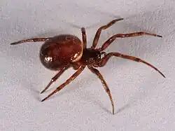 Besonders prominent ist unter den „Falschen Witwen“ die Edle Kugelspinne (S. nobilis), die einst auf Madeira und den Kanarischen Inseln beheimatet war, sich jedoch durch Einschleppung auch in West- und Mitteleuropa, im Maghreb[45][46] und im Nahen Osten[45] sowie im Westen der Vereinigten Staaten und auch in Teilen Südamerikas[45] etablieren konnte. Wie die als „White-tailed Spiders“ bekannten Spinnenarten Lampona cylindrata und Lampona murina wird auch die Edle Kugelspinne häufig für Bisse verantwortlich gemacht, die Nekrosen auslösen, wobei auch der Ruf dieser Art durch Medienberichte verschlechtert wurde. Auftretende Nekrosen nach dem Biss der Edlen Kugelspinne sind anders als bei den beiden anderen Spinnen tatsächlich belegt, dies ist aber selten der Fall; sie sind wahrscheinlich das Resultat einer bakteriellen Infektion der Bisswunde. Bisse der wie alle Haubennetzspinnen eigentlich nicht beißfreudigen Edlen Kugelspinne lösen einen Schmerz im Bereich der Bisswunde aus, dessen Empfinden ebenfalls mit dem eines Wespenstichs verglichen wird und meist nach 12, selten erst nach 24 Stunden abklingt.[47] So können durch Bisse der Edlen Kugelspinne Schwellung, Erythem (entzündliche Rötung) und Juckreiz im Bereich der Bisswunde als Symptome auftreten.[48]