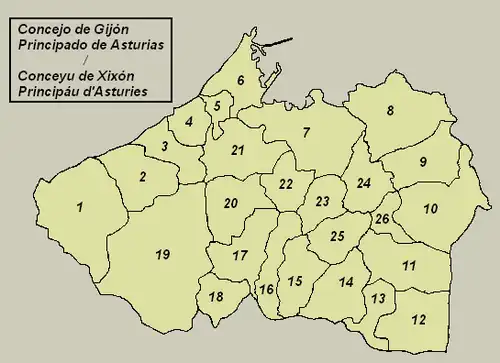 Die Gemeinde Gijón ist in 26 Parroquias (zu Deutsch: Pfarrei, Kirchspiel) unterteilt: