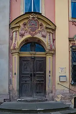 Der zweigeschossige barocke Putzbau mit reichem Stuckdekor, Mansardwalmdach, Dachreiter und Mittelrisalit hat eine Pilastergliederung sowie einen Dreiecksgiebel mit Uhr.