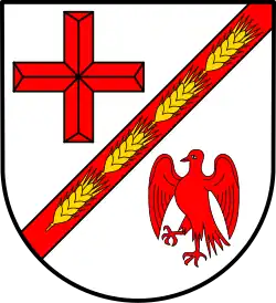 Blasonierung: „In Silber, geteilt durch eine mit vier goldenen Ähren belegte rote schräglinke Leiste, vorn ein schwebendes, geschliffenes rotes Kreuz, hinten ein auffliegender roter Vogel.“[12] |