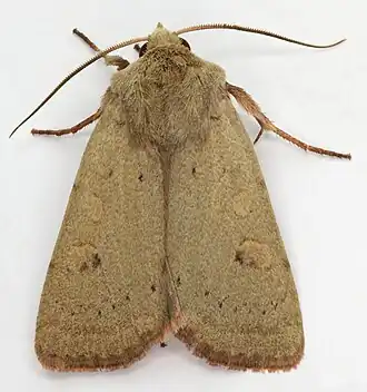 Die Falter erreichen eine Flügelspannweite von 36 bis 43 Millimetern.[2] Auf den Vorderflügeln dominieren oftmals fuchsrote bis kastanienbraune Tönungen. Gebietsweise sind jedoch Exemplare mit hell ockergrauer Grundfarbe vorherrschend.[3] Die Nierenmakel ist im Unterteil grauschwarz gefüllt. Weitere Zeichnungselemente sind meist undeutlich, nur schwach angedeutet oder fehlen ganz. Dadurch ist die Verwechslungsgefahr mit anderen Arten gering. Die Hinterflügel sind zeichnungslos dunkelgrau, die Fransen schimmern heller.
