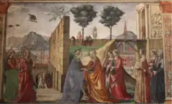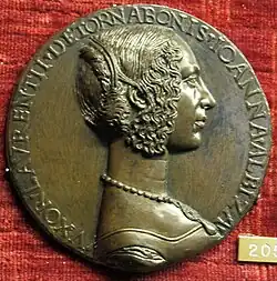 - Domenico Ghirlandaio: Heimsuchung Mariae, Porträt in der Assistenz, 1486–1490, Tornabuoni-Kapelle, Santa Maria Novella, Florenz. Am Ende des 15. Jahrhunderts dekorierte Ghirlandaio im Auftrag von Giovanni Tornabuoni einen der am besten erhaltenen Freskenzyklen aus dem Florenz des Quattrocento: Die Tornabuoni-Kapelle in der Dominikanerkirche Santa Maria Novella. In großformatigen Bildfeldern – je sieben Fresken an den Seitenwänden und der Stirnwand – sind die Lebenswege der Jungfrau Maria und Johannes des Täufers visuell nachzuvollziehen. Mit der Darstellung von zeitgenössischen Architektur- und Interieurelementen und insbesondere mit den zeitgenössischen Figuren, die die biblischen Szenen bevölkern, versetzt Ghirlandaio die heiligen Legenden ins frühneuzeitliche Florenz. Unter den zahlreichen dargestellten Zeitgenossen ist auch ein ganzfiguriges Porträt der Giovanna Tornabuoni. Die Identifizierung basiert auf ihren Porträtmedaillen und wird bestätigt durch Ghirlandaios Madrider Profilporträt, in dem Giovanna in fast identischer Pose und Gewandung dargestellt ist.