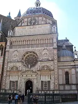 Giovanni Antonio Amadeo war an der Übernahme der toskanischen Renaissance in die Lombardei, wo er sich überwiegend betätigte, beteiligt. Trotz seines jungen Alters erhielt er 1470 den prestigeträchtigen Auftrag des Condottieres Bartolomeo Colleoni, dessen Grabkapelle, die von Guiniforte und Francesco Solari begonnene Colleoni-Kapelle in Bergamo, zu vollenden. Von 1470 bis 1475 war Amadeo für den Bau der Fassade verantwortlich, die mit polychromen Verzierungen und verschiedenen Skulpturen im antiken Stil, einigen Medaillons, kleinen Säulen, Büsten, Hochreliefs mit Geschichten aus dem Alten Testament und den Arbeiten des Herakles, die auf das humanistische Thema der Tugend des Condottiere anspielen, versehen ist. Beeinflusst von dem Florentiner Architekt Antonio Filarete, der zu dieser Zeit im Herzogtum Mailand tätig war, stellt er Motive, die von römischen Triumphbögen abgeleitet sind, Unstimmigkeiten mit klassischen Kanons gegenüber und zeigt so eine persönliche Umarbeitung antiker Modelle. Auf das antike Rom verweisen auch die über den Fenstern angebrachten Büsten von Julius Cäsar und Trajan, deren Figuren im Mittelalter Stärke bzw. Gerechtigkeit symbolisierten. Die Statuen mit weiblichen Figuren, die im antiken Stil gekleidet sind und Tugenden darstellen, werden von vielen als signiert angesehen, aber im Laufe der Zeit haben sie die Attribute verloren, die ihre Identifizierung ermöglichten, ebenso wie die Statue eines Mannes zu den Waffen über der zentralen Rosette, ein wahrscheinliches Porträt von Colleoni selbst als Domitor Fortunae (Glücksbringer), da er über der Rosette stehend dargestellt ist, die in der mittelalterlichen Ikonographie oft ein Symbol für das Glücksrad ist. Kritiker stellen in ihnen Einflüsse von Donatello und Agostino di Duccio fest.