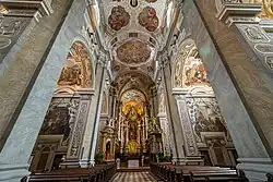 Der Galeriegang gehörte bis 1810 zur fürsterzbischöflichen Residenz. Das Kreuzgratgewölbe wurde mit Stuckaturen von Spaz geschmückt.[15]