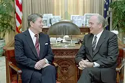 Oval Office | Fortschritt der START-Diskussionen Strategic Defense Initiative (SDI), Anti-Ballistic-Missile-Vertrag (ABM), Afghanistan, der Iran-Irak-Krieg. | |