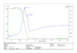 Beim Erhitzen geht das Kristallwasser verloren (TG-Kurve = Masseverlust, onset = Beginn der Wasserabspaltung, Peaks = Maxima der Reaktion), und es entsteht zuerst ein Hemihydrat (auch Halbhydrat, gebrannter Gips bzw. Bassanit genannt) mit der chemischen Formel CaSO4 • ½ H2O, bei weiterem Wasserverlust entsteht schließlich über den löslichen Anhydrit III der unlösliche Anhydrit II (CaSO4), letztere beide werden mineralogisch schlicht Anhydrit genannt.