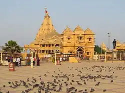 Der Somnath-Tempel nahe der Stadt Veraval ist ein Shiva-Tempel von großer spiritueller Bedeutung im Hinduismus. Der Tempel wird in den vedischen Schriften erwähnt und gilt als das heiligste der Shiva-Jyotirlingas. Ein erster Tempel wurde schon in vorchristlicher Zeit erbaut. Der Tempel wurde in seiner Geschichte vielfach durch islamische Eroberer zerstört (am bekanntesten sind die Zerstörungen durch Mahmud von Ghazni und später durch den Großmogul Aurangzeb), die den Tempel zum Teil in eine Moschee umwandeln ließen, aber jedes Mal wieder aufgebaut. Der jetzige Bau im Chalukya-Stil stammt aus den 1950er Jahren und wurde auf Initiative des damaligen indischen Innenministers Vallabhbhai Patel auf den damaligen Tempelruinen errichtet.[5][6]