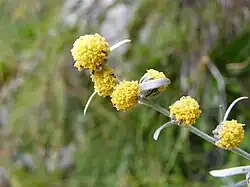 Es sind nur Röhrenblüten vorhanden. In einem Blütenkörbchen stehen etwa 15 Röhrenblüten[2] zusammen und alle sind fertil. Die äußeren Röhrenblüten sind weiblich und in geringerer Zahl vorhanden als die innenliegenden zwittrigen Blüten. Die fünf Kronblätter sind gelb und die Kronzipfel sind dicht behaart. Zwei Fruchtblätter sind zu einem unterständigen Fruchtknoten verwachsen. Es sind zwei Narbenäste vorhanden.