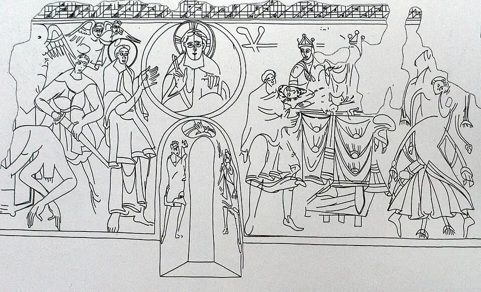– Die beiden Teile des Wandbildes seitlich der Mandorla enthalten die Geschichte der Passion des Täufers, allerdings nicht in chronologischer Folge, sondern – zusammen mit dem Motiv in der Fensterlaibung – als Szenen einer allgemeinen Opferung. In den erhaltenen Beispielen der mittelalterlichen Buchmalerei folgen auf das Gastmahl mit dem Tanz der Salome zunächst die Hinrichtung und anschließend die Übergabe des Hauptes durch Salome an ihre Mutter Herodias. Hier beginnt die Bilderzählung links mit der vom Henker bereits im Gefängnis vollzogenen Enthauptung; von dem Engel am linken Bildrand sind nur die Umrisse und ein großer Flügel zu sehen; der kleine, fliegende Engel daneben überbringt die personifizierte Seele des Johannes zu Christus. Rechts folgt die Szene mit dem Festmahl: Herodias und Herodes sitzen am prächtig gedeckten Tisch; beide tragen eine Krone mit kugelartigen Verzierungen; von Herodes sind nur Teile der Krone und seine Füße auf dem für Herrscher vorbehaltenen Fußschemel (Suppedaneum) zu sehen. Der von links hinzutretenden Diener präsentiert das Haupt des Johannes auf einer Schale. Rechts wirbelt die auf den Zehenspitzen tanzende Salome mit Bändern.