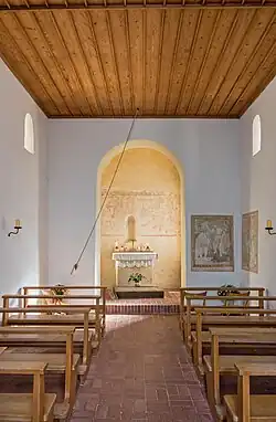 Das flachgedeckte Kirchenschiff wird durch drei kleine Rundbogenfenster beiderseits belichtet. Der um eine Stufe erhöhte Chor hat in der Apsiswand ein – heute vermauertes – Rundbogenfenster und seitlich zwei große Rechteckfenster; die ursprüngliche Flachdecke im Chor wurde im 18. Jahrhundert durch ein Tonnengewölbe ersetzt.[10]
