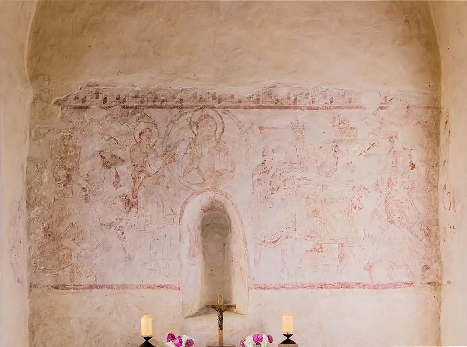 Die außerdem heute sichtbaren beiden Fresken im Winkel von Chor und Südwand des Langhauses mit Darstellungen der Taufe Jesu im Jordan und der Mantelteilung des heiligen Martin stammen aus dem 17. Jahrhundert.