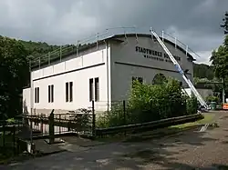 Das wenige hundert Meter flussaufwärts liegende städtische Wasserwerk ist ebenfalls nach Glüder benannt, befindet sich aber in der Nachbarortschaft Strohn. Es bereitet Oberflächenwasser aus der Sengbachtalsperre auf und pumpt es als Trinkwasser in das städtische Trinkwassernetz. Das zugehörige Turbinenhaus an der Wupper beherbergt ein Laufwasserkraftwerk und eine weitere Turbine, die von dem Grundablass der Sengbachtalsperre gespeist wird.[2]