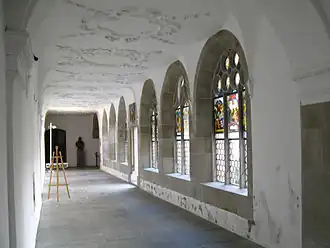 Einige Tage nach der Schlacht bei Kappel am 11. Oktober 1531 war das Kloster von Berner Truppen, die zu spät zur Schlacht erschienen waren, besetzt worden und erlitt dabei grosse Schäden. Auf Anordnung von Laurentius von Heidegg wurde der Kreuzgang 1534/35 neu errichtet, wobei die Bögen zum Innenhof hin zunächst unverglast blieben. Zwanzig Jahre später liess sein Nachfolger Johann Christoph vom Grüth die Bögen mit Glasgemälden schmücken. Die Abtei finanzierte die Masswerkfenster und die Gemälde in den Spitzbögen. Gemäss dem damaligen Brauch stifteten befreundete Klöster, die eidgenössischen Schirmorte der Abtei, benachbarte Städte, Magistraten und ausländische Gesandte die übrigen Glasgemälde. Die Wahl der Künstler überliessen sie dabei dem Abt.[1]