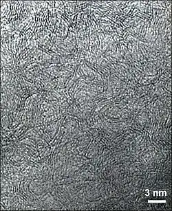 Glaskohlenstoff wird durch Hochtemperatur-Pyrolyse von Hartem Kohlenstoff hergestellt, der zunächst eine defektreichere und offenzelligere Porosität aufweist. Der mikrostrukturelle Übergang von Hartem Kohlenstoff zu Glaskohlenstoff erfolgt graduell je nach Pyrolysetemperatur und -dauer. Die sp2-hybridisierten Kohlenstoffatome sind wie bei Graphit in Basalebenen mit hexagonaler Symmetrie angeordnet. Die TEM-Aufnahme zeigt die kugelförmigen Strukturen, die kleine Poren von etwa 1 nm Durchmesser einschließen. Im Bild sind nur die Basalebenen zu sehen, die in Richtung des Elektronenstrahls orientiert sind.[3][4]