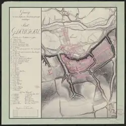 Es bildeten sich aber zunächst mindestens drei rechtlich unabhängige Teilstädte heraus: „Rechtstadt“ (Innenstadt mit Stadtmauer und Marktplatz), „Vorstadt“ (1525: „vorstat Glauchaw“,[25] später auch „Lange Vorstadt“ genannt, mit eigener Stadtmauer und Gerichtsbarkeit) sowie die Teilstadt „Hain“ südlich der Burg. Später entstand im Spätmittelalter oder der Frühen Neuzeit noch die damals „Oberstadt“ genannte Gemeinde, die keine Stadtrechte besaß und eine Dorfgemeinde war. Alle Dörfer und Einwohner der Herrschaft Glauchau (außer die der „Rechtstadt“ und der „Vorstadt“) waren dem Landgericht in der Vorstadt rechtlich unterstellt.[26]