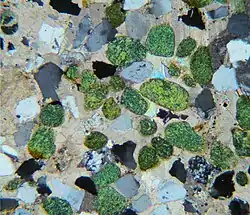 Unter dem Mikroskop erscheint Glaukonit im Gegensatz zu anderen Glimmern nicht in der Form von schichtförmig gepackten Kristallen oder Blättchen, sondern als rundliche Körner (Pellets), in denen die Kristalle keine bevorzugte Orientierung haben. Diese fallen sofort durch ihre kräftig gelb- bis blaugrüne Eigenfarbe auf, die bei beginnender Oxidation zu Limonit nach Braun umschlägt. Für manche dieser Pellets wird eine Herkunft aus den Exkrementen (Kotpillen) unbekannter mariner Organismen angenommen; sie sind aber auch als Füllungen der Kammern von Foraminiferen zu finden.[8]