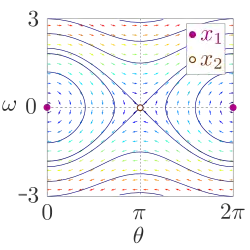 Das System hat damit zwei Gleichgewichtspunkte und , welche die Gleichgewichtsbedingung erfüllen. Der Gleichgewichtspunkt bei einem Winkel von Null ist das stabile Gleichgewicht, wenn das Pendel keine Auslenkung und Geschwindigkeit besitzt. Der zweite Punkt ist das instabile Gleichgewicht, wenn das Pendel keine Geschwindigkeit besitzt und „auf dem Kopf“ steht. Im Phasenraum ist ein elliptischer Fixpunkt, der Punkt ein hyperbolischer Fixpunkt.