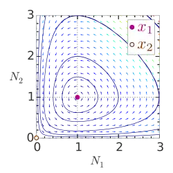 Das System besitzt einen stabilen Gleichgewichtspunkt und einen instabilen Gleichgewichtspunkt . Im Zustand gibt es eine konstante Anzahl an Räubern und Beutetieren, die in einem ökologischen Gleichgewicht sind. Im Zustand sind beide Populationen ausgerottet.