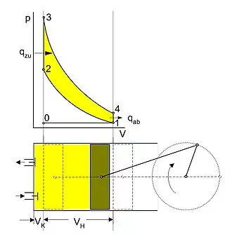 - die Verbrennung erfolgt nicht vollkommen isochor, weil sie Zeit benötigt, in der sich die Kurbelwelle weiter dreht: Die Zündung erfolgt bereits vor dem oberen Totpunkt und die Verbrennung wird erst während der Expansion abgeschlossen. Die extreme Druck-Spitze (3) im Zustandsdiagramm wird so abgemindert und nach rechts verschoben abgerundet, was den Motor schont, aber die Effizienz verringert.