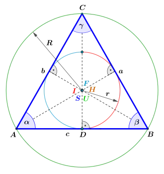 Im gleichseitigen Dreieck schneiden sich die Höhen, die Mittelsenkrechten (Seitensymmetralen), die Seitenhalbierenden (Schwerelinien) und die Winkelhalbierenden in einem gemeinsamen Punkt. Daher sind auch die fünf ausgezeichneten Punkte, der Höhenschnittpunkt , der Umkreismittelpunkt , der Schwerpunkt , der Inkreismittelpunkt und der Mittelpunkt des Feuerbachkreises derselbe Punkt. Dieser Punkt teilt die Höhen, z. B. , im Verhältnis d. h. Wie im nebenstehenden Bild erkennbar, fällt der Feuerbachkreis (hellblau) mit dem Inkreis (rot) zusammen; für beide gilt der gleiche Radius