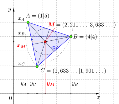 Der Mittelpunkt , das heißt der Schnittpunkt der Mittelsenkrechten, Seitenhalbierenden und Höhen, eines Dreiecks mit Ecken , und besitzt die folgenden Koordinaten: