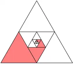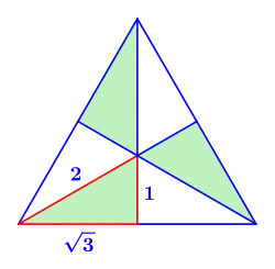 Gegeben sei eine unendliche Folge gleichseitiger Dreiecke, in der jedem Dreieck jeweils das nachfolgende Dreieck so einbeschrieben ist, dass jede Seite von durch den Eckpunkt des Nachfolgers halbiert wird. O.B.d.A. wird der Seite des Ausgangsdreiecks die Länge 1 zugeordnet. Dann gilt:
