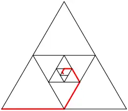 Die Gesamtlänge der Linienspirale (rot) ist gleich der Seitenlänge des Ausgangsdreiecks.