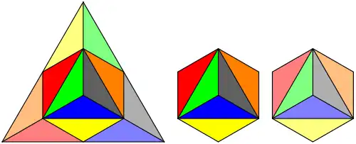 Ein gleichseitiges Dreieck, dessen Seite ohne Beschränkung der Allgemeinheit die Länge 1 hat, lässt sich so in zwölf kongruente gleichschenklige Dreiecke zerlegen, dass man hieraus zwei kongruente regelmäßige Sechsecke mit der Seitenlänge bilden kann.