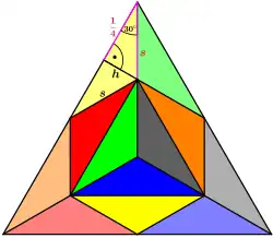 Nachdem Platon die fünf platonischen Körper den Elementen zuordnet (Tetraeder–Feuer, Oktaeder–Luft, Ikosaeder–Wasser, Dodekaeder–Kosmos und Hexaeder–Erde), beschreibt er im Timaios (53b-56c) diejenigen regulären Vielecke, welche die Oberflächen der platonischen Körper bilden.[3] Er unterteilt die Vielecke in besondere gleichseitige Dreiecke (direkt vorhanden in Tetraeder, Oktaeder und Ikosaeder bzw. virtuell in den Fünfeckflächen des Dodekaeders) sowie in besondere gleichschenklig-rechtwinkligen Dreiecke (virtuell vorhanden in den Quadratflächen des Hexaeders).