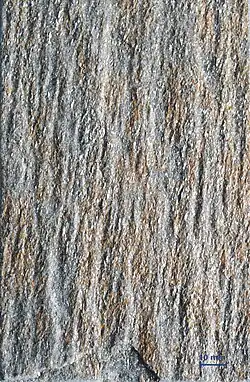 Dieser Naturstein ist ein stark glimmerhaltiger Quarzit aus dem Präkambrium, der sich entlang von Schwächezonen in seinen Schieferungsebenen gut spalten lässt. Durch den Spaltvorgang entsteht eine runzelige Oberfläche, auf der unzählige Blättchen des silbrigen bis bräunlichen Muskovit-Glimmers in linear geregelter Ausrichtung angeordnet sind. Dadurch ergibt sich im auftreffenden Licht ein auffälliger wechselvoller Glitzereffekt. Die Farbtönung des Gesteins liegt zwischen beige und braun, auch Grautöne treten auf. In den Lagerstätten gibt es durch zunehmende Gehalte von Feldspat in petrographischer Hinsicht stellenweise eine Übergangsfazies zu einem Gneis mit plattiger Ausprägung.[1][2]