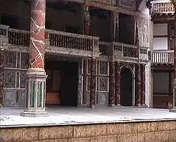 An der Bühnenrückseite befanden sich mehrere Zugänge. Zumindest der mittlere davon konnte durch einen Vorhang verschlossen und als Teil der Spielfläche benutzt werden, zum Beispiel für intime Szenen. Die Galerie im ersten Stock hinter der Bühne wurde ebenfalls für Aufführungen genutzt. Man konnte sie zum Beispiel als Balkon nutzen, wie in der berühmten Szene aus Romeo und Julia, hier konnte ein Redner auftreten oder auch ein Berg erklommen werden. Auf dem obersten Stockwerk mochten auch Musikanten sitzen, die – im elisabethanischen Theater üblich – die Stücke mit Musik bereicherten. In Einzelfällen wurden diese Plätze auch an gut zahlende Zuschauer vergeben.