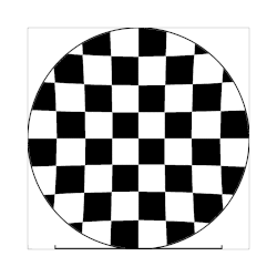 mit dem Verzeichnungsparameter , die im Grenzfall mit der Tangensbedingung identisch ist. Der Spezialfall ist in der Literatur als Kreisbedingung bekannt und liefert die von Helmholtz in seinem Schachbrett implementierte kissenförmigen Verzeichnung[7]. Ein weiterer Grenzfall mit führt zu der Winkelbedingung