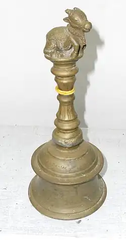 Die in Tempeln hängende große Priesterglocke ghanta (auch gante) gehört zu hinduistischen Tempelritualen (puja) im indischen Kulturraum. Neben der männlichen Form ghanta für hängende Glocken kann die weibliche Form ghanti – neben ghanta – in nordindischen Sprachen kleine Handglocken bezeichnen.[49] Ritualglocken gelangten in früher Zeit von Indien nach Tibet.[50] In Indien sind Schellen (Fußschellen ghungru) und kleine Glocken, die anfangs in Ritualen der vedischen Religion verwendet wurden, seit ungefähr dem 6. Jahrhundert v. Chr. bekannt.[51] Sie sind zusammen mit Gongs und anderen Musikinstrumenten auf Reliefs an den Stupas von beispielsweise Sanchi, Bharhut, Mathura und Amaravati ab dem 3. Jahrhundert v. Chr. und an frühmittelalterlichen Hindutempeln abgebildet.[52]