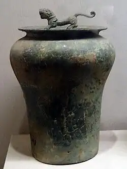 Die ältesten Glocken waren kleine Tongefäße (陶鐘 / 陶钟, táozhōng – „Tonglocke“), etwa neun Zentimeter hoch und fünf Zentimeter im Durchmesser, die aus der Zeit um 3000 v. Chr. in der Provinz Henan gefunden wurden und zur Yangshao-Kultur gehörten. In der Provinz Shaanxi wurden aus der Longshan-Kultur stammende Tonglocken entdeckt, die um 2000 v. Chr. datiert werden und wie die späteren Bronzeglocken bereits eine elliptische Form besitzen. Andere kleine Glocken aus Ton, in deren Bienenkorbform am Schulterbereich zwei Löcher ausgespart sind, besitzen einen Handgriff und wurden durch einen Klöppel im Innern angeschlagen. Sie werden taoling oder nach den ähnlich geformten, späteren Bronzeglocken mit Klöppel ling genannt.[23] Solche Glocken wurden aus dem 4. und 3. Jahrtausend v. Chr. unter anderem in den Provinzen Henan und Gansu gefunden. Das älteste bekannte Glöckchen aus Bronze wird auf etwa 2100 v. Chr. datiert. Es stammt aus einem Grab von Kesheng zhuang in der Provinz Shaanxi und gehört zur Longshan-Kultur.[24] In Dahecun (Provinz Henan) wurden ähnlich aussehende Tonglocken und Bronzeglocken jeweils mit Klöppeln ausgegraben, die zur Erlitou-Kultur gehören und in das 19. bis 16. Jahrhundert v. Chr. datiert werden.[25]